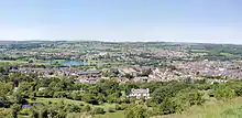 The geology of the valley is split, with Upper Wharfedale consisting of carboniferous limestone of the Yoredale series.[17] In the lower part of Wharfedale, around Ilkley and Otley, the underlying stone is mostly millstone grit,[18] which can be seen best at the Cow and Calf rocks on the south side of the valley on Ilkley Moor.[19]