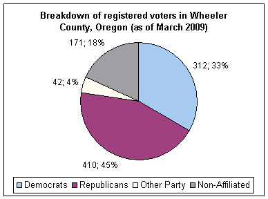 Though Wheeler County is located in central Oregon, politically it falls in line with the eastern side of the state. The majority of registered voters who are part of a political party in Wheeler County, as well as most counties in eastern Oregon, are members of the Republican Party,[16] and the last Democrat to win a majority in the county was Jimmy Carter in 1976.