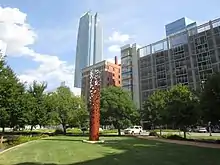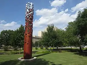 The 26-foot (7.9 m) tall sculpture, installed in 2012, is made of powder coated steel, stainless steel, concrete, bronze, and LED lighting. The base is circular and red, and the sculpture becomes increasingly modular and reflective with height.[1] Smith has said of the artwork: