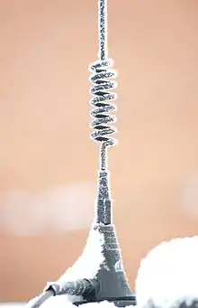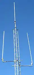 In a whip antenna not mounted on a conductive surface, such as one mounted on a mast, the lack of reflected radio waves from the ground plane causes the lobe of the radiation pattern to be tilted up toward the sky so less power is radiated in horizontal directions, undesireable for terrestrial communication.[2] Also the unbalanced impedance of the monopole element causes RF currents in the supporting mast and on the outside of the ground shield conductor of the coaxial feedline. To prevent this, with stationary whips mounted on structures, an artificial "ground plane" consisting of three or four rods a quarter-wavelength long connected to the opposite side of the feedline, extending horizontally from the base of the whip, is often used.[2] This is called a ground plane antenna.[3] These few short wire elements serve to receive the displacement current from the driven element and return it to the ground conductor of the transmission line, making the antenna behave as if it has a continuous conducting plane under it. Often (see pictures) the ground plane rods are sloped downward, to lower the main lobe of the radiation pattern closer to horizontal and increase the normal 36.8 ohm radiation resistance closer to 50 ohms to provide a better impedance match with standard 50 ohm coaxial cable feedline.