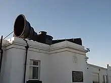 In 1890, a more efficient light was installed in the South Light, allowing the North Light to be deactivated: an occulting mechanism was installed, which eclipsed the light once every thirty seconds, and a red sector was added marking Whitby Rock.[10] The former Low Lightouse was then demolished but the site was retained for a building to house new fog signalling apparatus,[11] including a compressed air plant powered by two Hornsby horizontal 25-horsepower oil engines.[3] Following trials of different types of signal (conducted at St. Catherine's Lighthouse in 1901) Trinity House took the decision to use sirens at Whitby, sounded through a pair of 'Rayleigh trumpets' (named after the scientific adviser at the trials).[12] Over the next decade or more Trinity House went on to install similar equipment in several other lighthouse locations. Whitby Fog Signal (known locally as the 'Hawsker Bull') was operational from 1903 and continued in use until 1987, the equipment having been updated in 1955. The building, which retains the twin roof-mounted 20-ft trumpets, is now a private dwelling, part of which is also used as holiday accommodation.[13]