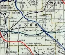 In 1887, the Chicago, Kansas and Nebraska Railway built a main line from Topeka through White City to Herington.[12] The Chicago, Kansas and Nebraska Railway was foreclosed in 1891 and taken over by Chicago, Rock Island and Pacific Railway, which shut down in 1980 and reorganized as Oklahoma, Kansas and Texas Railroad, merged in 1988 with Missouri Pacific Railroad, merged in 1997 with Union Pacific Railroad. Most locals still refer to this railroad as the "Rock Island".