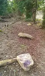 It is possible that the Upper White Horse Stone was once part of a chambered long barrow that has otherwise been destroyed.[50] Philp and Dutto, however, noted that its identification as part of a long barrow was "uncertain".[42] In supporting this possibility, Evans noted that upright stone resembled a "chamber wallstone" akin to those at Coldrum and Kit's Coty House.[51] However, there is no visual trace of any earthen mound having existed next to the monolith.[42] Nine smaller stones extend westward from the White Horse Stone for about ten metres.[42] It is possible that these stones were not placed there in the Early Neolithic but were moved there at a later date by local farmers who found them in their fields.[42]
