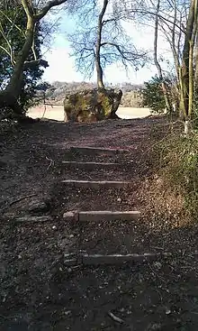 In 1987, members of the Odinic Rite formed the Guardians of the White Horse Stone, a group devoted to protecting the site; they installed timber steps from the Pilgrim's Way enabling visitors better access to it.[73] In the 1990s, they unsuccessfully campaigned to stop the Channel Tunnel Rail Link from being tunnelled close to the Stone.[78] The Guardians group fell dormant, although was revived in 2004 to deal with a new situation;[73] in 2003, the telecommunications company Orange sought planning permission to build a radio tower within a few metres of the stone. The Odinic Rite, in tandem with another Folkish Heathen group called Woden's Folk,[lower-alpha 1] successfully petitioned Tonbridge and Malling Council to reject the proposal. In 2006, Orange revived their application, although this time proposed to move the tower further from the White Horse Stone. The Guardians again campaigned against this.[78] The White Horse Stone has also been vandalised on various occasions, with visitors having drawn and painted on it. Members of the Odinic Rite have endeavoured to remove this graffiti using methods they believe are not harmful to the stone.[80]