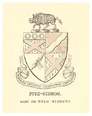 The last recorded holder of the title of the White Knight was Maurice Fitzgibbon of Crohana, Kilkenny, who assumed the title in 1858.[30] Though the 'Kilkenny' branch of the family has since become extinct, the 'Limerick' branch remains extant.[31] The Fitzgibbons of Limerick represent the last remaining branch of the Fitzgibbon lineage.[32][33][34] The Fitzgibbons of Limerick held the title Earls of Clare (see: John FitzGibbon, 1st Earl of Clare) from 1794 until 1864.[35]
