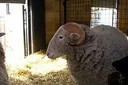 The Whitefaced Woodland is one of the largest hill breeds, with ewes sometimes weighing more the 60 kg (132 lbs) when kept in lowland pastures. Unlike most Pennine breeds it has a white face and legs and short, fine wool. The staple length of the wool is between 10 cm (4.7 inches) to 15 cm (7.1 inches) with a spinning count of 50's to 54's. The average fleece weight is 2 kg (4.5 lb) to 3 kg (6.5 lb).[1] Its main use has been as a meat breed. However, its wool is used in carpet.[4] Both sexes are horned and the ram horns are heavily spiraled.
