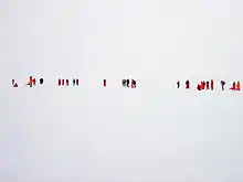 Whiteout, white-out,[1] or milky weather[2] is a weather condition in which the contours and landmarks in a snow-covered zone become almost indistinguishable.[1] It could be also applied when visibility and contours are greatly reduced by sand. The horizon disappears from view while the sky and landscape appear featureless, leaving no points of visual reference by which to navigate; there is absence of shadows because the light arrives in equal measure from all possible directions.[1] Whiteout has been defined as: "A condition of diffuse light when no shadows are cast, due to a continuous white cloud layer appearing to merge with the white snow surface. No surface irregularities of the snow are visible, but a dark object may be clearly seen. There is no visible horizon."[3]