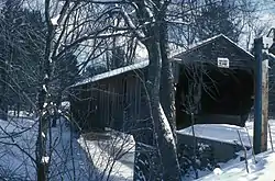 The Whittier Bridge is a historic wooden covered bridge in Ossipee, New Hampshire. The bridge carried an old alignment of New Hampshire Route 25 (now Nudd Road and Old Covered Bridge Road) over the Bearcamp River. Built in 1870, it is one of New Hampshire's few surviving 19th-century covered bridges, and a rare example of a Paddleford truss. The bridge was listed on the National Register of Historic Places in 1984.[1] It was closed to vehicular traffic in 1989,[2] and was removed from its footings for restoration in 2008. As of September 2019, the bridge is resting on Nudd Road adjacent to the crossing point.[3]