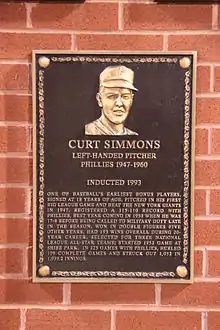 Konstanty became the second Phillie to win the Most Valuable Player Award, after Chuck Klein (1932);[30] his 22 saves and 16 wins by a reliever were both National League records at the time.[31][32] Ennis led the team in batting average, home runs, and runs batted in,[33] while Roberts' 20 wins in 1950 were the beginning of six consecutive seasons with 20 or more wins for the pitcher.[34] As the catcher, Seminick provided veteran leadership for the team and helped guide the young pitching staff. Roberts said of Seminick,"If you had to pick a guy in the clubhouse who was our leader that year, it would be Andy. He always played hard, and that was his best year by far."[35] Six players have since been elected members of the Philadelphia Baseball Wall of Fame: outfielder Ashburn; pitchers Roberts, Konstanty, Simmons; and infielders Hamner and Jones.[36] National Baseball Hall of Fame and Museum inductees from the Whiz Kids include Roberts, who entered the Hall in 1976,[37] and Ashburn, elected in 1995.[38] The "Whiz Kids" name endured for the Phillies franchise into the 1980s, when the 1983 Philadelphia Phillies, a team of veteran players who faced the Baltimore Orioles in the World Series that season, were coined the "Wheeze Kids".[39]