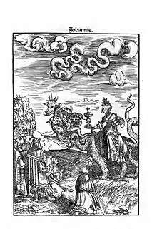 The Whore is associated with the Beast of Revelation by connection with an equally evil kingdom. The word "Whore" can also be translated metaphorically as "Idolatress".[1] The Whore's apocalyptic downfall is prophesied to take place in the hands of the image of the beast with seven heads and ten horns. There is much speculation within Christian eschatology on what the Whore and beast symbolize as well as the possible implications for contemporary interpretations.[2][3][4][5]