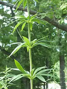 In botany, a whorl or verticil is an arrangement of leaves, sepals, petals, stamens, or carpels that radiate from a single point and surround or wrap around the stem or stalk.[1][2] A leaf whorl consists of at least three elements; a pair of opposite leaves is not called a whorl.