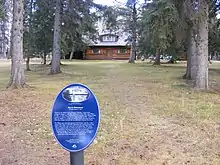 Welcoming visitors to the town of Banff is the face of the legendary guide Bill Peyto. Ebenezer William Peyto came to Banff from England in the early 1890s. Peyto, a prospector, hunter-trapper, warden and guide, used this cabin to store his outfitting and trapping supplies. With Peyto's cabin as well as those of Jack Sinclair, Jimmy Simpson, and Fred Ballard, this property by the Bow River became Banff's outfitting and guiding center. In the 1930s Peter and Catherine Whyte moved the cabin closer to their house and used it to house their Stoney friends while painting portraits.[8]