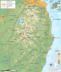 The Wicklow Mountains are the largest area of continuous high ground in Ireland, having an unbroken area of over 500 km2 (190 sq mi) above 300 metres (980 ft).[7] They occupy the centre of County Wicklow and extend into Counties Dublin, Carlow and Wexford.[8] The general direction of the mountain ranges is from north-east to south-west.[9] They are formed into several distinct groups: that of Kippure in the north, on the boundary of Dublin and Wicklow; Djouce, Tonelagee, Camaderry and Lugnaquilla in the centre; Church Mountain and Keadeen Mountain in the west; and Croghan Kinsella to the south.[9] To the east, separated from the rest of the range by the Vartry Plateau, is the group comprising the Great Sugar Loaf, Little Sugar Loaf and Bray Head.[9]