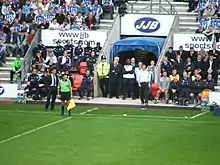 Wigan appointed Roberto Martínez, then manager of Swansea City, as manager prior to the 2009–10 Premier League season.[13] He previously played for Wigan from 1995 to 2001. On 26 September, they claimed their first three points against a "Big 4" team after beating Chelsea 3–1, with goals from Titus Bramble, Hugo Rodallega and Paul Scharner. A late surge that included a 1–0 win over Liverpool and a 3–2 win over Arsenal – the latter of which saw Wigan recover from two goals down with ten minutes remaining to win in injury time – saw the team once more survive relegation. Most notably, having never defeated any of the traditional "Big Four" in the league until their win over Chelsea (and with only one win over any of them in cup competitions), Wigan ended the season having defeated three of them at home. Despite this high, the season also saw two humiliating 8 goal defeats, firstly a 9-1 thrashing at Tottenham in November,[14] and finally an 8–0 defeat to Chelsea on the final day of the season, a match which saw their opponents crowned Premier League champions.[15]