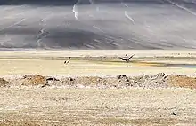 Many species of finches, robins, redstarts (like the black redstart) and the hoopoe are common in summer. The brown-headed gull is seen in summer on the river Indus, and on some lakes of the Changthang. Resident water-birds include the brahminy duck also known as the ruddy sheldrake, and the bar-headed goose (Ladakhi: ngangpa). The black-necked crane (trhung-trhung) is a rare species found scattered in the Tibetan plateau, and is also found nesting in summer in parts of Ladakh. Other birds include the raven, red-billed chough (chungka), Tibetan snowcock and chukar (a partridge, srakpa).[1] The lammergeier and the golden eagle are common raptors here. Marshes of Ladakh is a good breeding ground for many migratory birds.