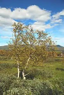 In the mountains, the conifers are replaced by birch (Betula pubescens ssp. tortuosa), which forms the tree-line in most areas. The undergrowth in these forests is quite variable. Under wet and nutrient-rich conditions, a luxuriant vegetation may develop, consisting of tall herbs such as Aconitum septentrionale, Angelica archangelica and Cicerbita alpina. Above the birch forest, starting at 300–1000 m, depending on latitude, there are usually willow-thickets, and above these alpine heath or meadows, the former dominated by dwarf shrubs of the family Ericaceae, the latter by sedges, rushes and various herbs such as Saxifraga spp., Dryas octopetala and Draba spp. Ranunculus glacialis reaches the highest altitude of all plants in Sweden, often growing near the ever-shrinking glaciers.