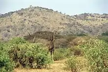 Arusha National Park is spread over an area of 552 square kilometres (213 sq mi).[10] It is within the riverine, lacustrine, and palustrine wetland ecosystem. It encompasses the montane forests and alpine deserts of Mount Meru, Africa's fifth highest mountain at 4,566 metres (14,980 ft).[10] The park also has marshy areas, rolling grassy hills, and wooded savannah.[10] The Ngurdoto Crater,[10] the Momela Lakes,[10] and one of the sources of the Pangani River are within the park. Wild animals and birds reported in the park include elephant (uncommon), leopard, waterbuck, spotted hyena, giraffe, blue monkey, colobus monkey, turaco, trogon, African buffalo, warthog, klipspringer, and red-hot poker.[10] Water birds are also concentrated in large numbers in the lake areas, particularly flamingos.[10] The park is near the city of Arusha, and the Kilimanjaro International Airport is 60 kilometres (37 mi) away.[10][6][7][11]