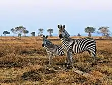 Serengeti National Park is the oldest and most popular national park which was established in 1951, with an area of 14,763 square kilometres (5,700 sq mi). The habitat, bounded by Kenya and bordered by Lake Victoria on the west, is characterized by vast plains, savannah, wooded hills, large termite mounds, rivers, and acacia woodlands. The spectacular wildlife witnessed in the park generally refers to the great Wildebeest migration where a million wildebeests[31] chase green lands across the rolling plains of Serengeti in Tanzania and Masai Mara in Kenya. Sometimes they are seen in 40 square kilometres (15 sq mi) long columns migrating across the rivers to the north, over a distance of 1,000 square kilometres (390 sq mi), after spending three weeks of mating and giving birth to 8000 calves daily. This migration and life cycle creation is an annual feature witnessed in the park. This migration is in unison with 200,000 zebra and 300,000 Thomson's gazelle in search of grazing pastures, aptly described as "six million hooves pound the open plains". Other mammals seen here are buffaloes, elephants, giraffe, large number of elands, topis, kongonis, impalas, and Grant's gazelles. The predators inhabiting the park are lions, leopards, jackals, spotted hyenas, rock hyrax and serval cats. Reptiles include agama lizards and crocodiles. Bird species recorded are more than 500, which include ostrich and secretary bird. 100 varieties of dung beetle are also reported.[32]