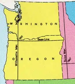 Beginning here, the Willamette meridian was established running north to Puget Sound and south to the California border, and the baseline was established running east to the Idaho border and west to the Pacific Ocean.[3]