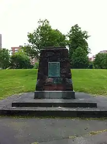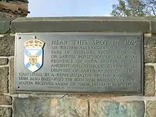 Lord Stirling's efforts at colonisation were less successful, at least in monetary terms, as his recruitment efforts made unrealistic promises about the new territory and were offered on meager terms.[7] He briefly established a Scottish settlement at Port Royal, Nova Scotia, led by his son William Alexander (the younger). However the effort cost him most of his fortune, and when the region—now Canada's three Maritime Provinces and the state of Maine—was returned to France in 1632, it was lost. He was unable to obtain from the treasury, in spite of royal support, £6,000 as compensation for his losses.[7] He spent his later years with limited means. However Alexander's settlement provided the basis for Scottish claims to Nova Scotia, and his baronets provided the Coat of arms of Nova Scotia and Flag of Nova Scotia which are still in use today.[8]