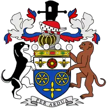 His coat of arms are a curiosity, since he was allowed by the heraldic authority to include his dog Fred and the monkey Bimbo. Fred had often escaped from the castle and ran to the nearby Chessington Zoo in Surrey, where he was regularly collected by the chauffeur in the Rolls Royce of Lord Black. In the same zoo, of which Lord Black was one of the directors, the monkey Bimbo had escaped once and was only caught after a lengthy hunt. The baron was thankful for the publicity, and concluded that it would be a nice idea to include the pair of animals in his coat of arms.[10]