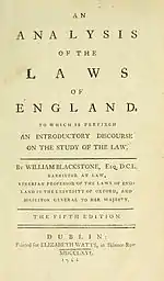 In 1756 Blackstone published the first of his full legal texts, the 200 page An Analysis of the Laws of England. Published by the Clarendon Press, the treatise was intended to demonstrate the "Order, and principal Divisions" of his lecture series, and a structured introduction to English law. Prest calls this "a marked advance on any previous introduction to English law . . including constitutional, civil and criminal law, public and private law, substantive law and procedure, as well as some introductory jurisprudential content".[48] The initial print run of 1,000 copies almost immediately sold out, leading to the printing of three more 1,000-book lots over the next three years, which all sold out. A fifth edition was published in 1762,[49] and a sixth, edited to take into account Blackstone's Commentaries on the Laws of England, in 1771.[50] Because of the success of the Commentaries, Prest remarks that "relatively little scholarly attention has been paid to this work";[48] at the time, however, it was hailed as "an elegant performance . . calculated to facilitate this branch of knowledge".[49]