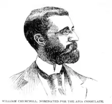 William Churchill, FRAI, AIA, AAG (October 5, 1859 – June 9, 1920) was an American Polynesian ethnologist and philologist, born in Brooklyn, New York, and educated at Yale, where he wrote for campus humor magazine The Yale Record. In 1896 he became consul general to Samoa. In 1897 his commission was extended, making him also Consul General to Tonga. In 1902 he began working for New York Sun, where he later became a member of the editorial staff. In 1915, he took a position as research associate in primitive philology at the Carnegie Institution in Washington, D.C.[1]