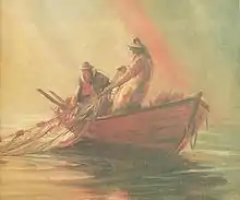 During his career deGarthe created a number of important works in oils, notable among them Looking for the Mothership, an evocative 1955 painting depicting a dory carrying a lone fisherman, searching for his lost home schooner. The same year, the Nova Scotia Museum of Fine Arts, now the Art Gallery of Nova Scotia, acquired its first deGarthe painting, Out of the Hurricane. In 1963, deGarthe created two large murals for St. John's Anglican Church in Peggy's Cove. The canvasses, 136 x 210 cm, depict a fishing boat on stormy seas with four fishers appearing to reach out to a figure of Christ on the water, surrounded by 12 gulls.