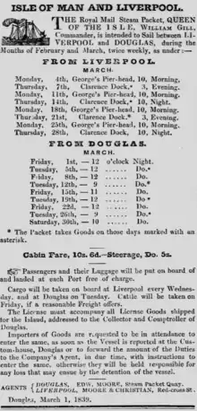 Captain Gill's reputation led to his appointment as Master of the Isle of Man Steam Packet Company's new steamer Mona's Isle when service commenced in August 1830.[1] At that time the St George Steam Packet Company were the primary operators on the route with their vessel the Sophia Jane under the command of Lieutenant Tudor, RN, but the ship was very unpopular in terms of comfort and reliability.[1] The onus therefore fell upon Capt. Gill and the Mona's Isle to operate an efficient and reliable service, with comfort of the passengers also to be of a high priority. Unlike the Sophia Jane the Mona's Isle had been designed primarily to shelter passengers and had spacious and comfortable cabins.[1]