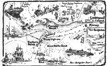 With the increasing commercial trade into and out of Liverpool coming with the advent of the steamship, various attempts were made to chart a safe navigable channel through the south eastern portion of Liverpool Bay and into the River Mersey at all states of the tide. According to a crew member of Capt. Gill's, John Bell, who began his service as a deck boy on the Queen of the Isle in 1836, the task was something which Capt. Gill went about in a meticulous way.[9] Bell is recorded as saying that Capt. Gill would be always taking various bearings from his positions to places on the shore, such as the Leasowe Castle and the Beacon on Bidston Hill.[9] A record of the depth of the water at various states of the tide was found by two sailors, one port and one starboard using a lead line, and this would be logged by Capt. Gill.[9] Another part of the arduous task would require Capt. Gill to lower his anchor some two or three feet below the draught of his steamer and, dragging this with him, let it go when he got nearly ashore on a sand-bank. It was in this way that he was able to discover the channel which was to make the modern shipping fortunes of Liverpool.[9]