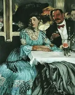 Chez Mouquin, in the collection of the Art Institute of Chicago, is arguably Glackens’s most celebrated painting. It is set in the well-known Sixth Avenue restaurant regularly visited by Glackens and many of his associates. This lush painting portrays a robust, red-tied James B. Moore, restaurateur and middle-aged bon vivant, at a table with one of the many young women he squired about town. He is drinking, while the lady is turned away, looking somewhat less interested in the convivial scene around them. The backs of their heads are reflected in the mirror behind them, as are the faces and profiles of others, including Edith Glackens and her art critic brother-in-law, Charles Fitzgerald. The painting is often compared to those of Degas, but “the sense of despair in Degas’s [cafe] pictures is replaced in the Glackens by a buoyant 'joie de vivre.'"[27]