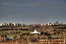 The Heritage Amphitheatre is western Canada's largest outdoor amphitheatre, which completed construction in 1985. It has seating for 1,133 people and up to 2,900 people with the surrounding grass area. Each year approximately 50,000 people visit it to enjoy musical, dramatic, and other performances in Edmonton's pleasant summer months.[5] The amphitheatre is host to many of Edmonton's festivals, including the Freewill Shakespeare Festival, Rockfest, Edmonton's Labatt Blues Festival, the Symphony Under the Sky Festival (run by the Edmonton Symphony Orchestra), the Edmonton Heritage Festival (the event that gave the Heritage Amphitheatre its name), and the Interstellar Rodeo Festival.[6] Although the amphitheatre is within Hawrelak Park, it is run by the City of Edmonton Civic Events Office, and not the Parks Department. A wind storm in 2013 ripped the canopy, forcing the replacement of the canopy in 2014, and making events like the Freewill Shakespeare Festival move venues temporarily.[7]