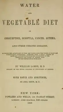 Lambe suffered from a variety of chronic diseases so gave up animal food in 1806 and embraced a vegetable and distilled water diet.[3] His health improved so he continued the diet on a permanent basis. Lambe tried the diet on several of his patients and published the results in a book in 1815.[3] In 1816, there was an extensive review of Lambe's book in The Medico-Chirurgical Journal and Review.[4] Lambe converted his patient John Frank Newton to vegetarianism.[5]