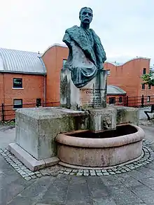 The memorial consists of a double life size bronze portrait bust of Coulson on a concrete and stone pedestal which in turn stands on a pink granite base with drinking troughs - one for cattle and horses and the other for dogs - at the front and back. The bronze bust was sculpted by Arnold Rechberg and cast by the Rudier Foundry in France.[5] The pedestal is inscribed on the front: "William Lisle Blenkinsopp Coulson, 1841[note 1]–1911. Erected by public subscription in memory of his efforts to assist the weak and defenceless among mankind and in the animal world." On the back of the pedestal is inscribed a quotation from Coulson: