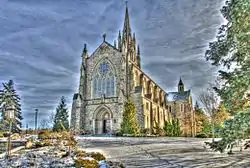 One of Irvine's most ambitious undertakings as headmaster was the construction of a chapel on Mercersburg's campus. Irvine engaged noted architect Ralph Adams Cram to design the building and spent decades overseeing its planning and construction. Construction was completed in 1926, and the chapel was dedicated to Mercersburg alumni killed in World War I. Grace Coolidge attended the dedication ceremony.[12] The spire is a replica of that of University Church of St Mary the Virgin in Oxford, and it contains a traditional carillon.[13]