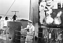 McGonagle took command of the USS Liberty in April 1966. On June 8, 1967, during the Six-Day War between Israel and her Arab neighbors, the Liberty was attacked by Israeli forces while sailing in international waters in the Eastern Mediterranean.[1] The Israeli government claims to this day that they thought that the ship was an Egyptian vessel. Israel relentlessly attacked the Liberty with jets, helicopters, and motor torpedo boats. McGonagle was severely wounded during the first air attack and although the bridge had sustained heavy damage he stayed and directed the defense of the ship, refusing to leave his post for medical attention. As the Israeli fighters continued their attack he maneuvered his ship, directed its defense, supervised the control of flooding and fire, and saw to the care of the casualties. Captain McGonagle remained at his battle station and continued to command his ship for more than 17 hours. It was only after rendezvous with a United States destroyer that he relinquished personal control of the Liberty and permitted himself to be removed from the bridge.[2] The combined air and sea attack killed 34 crew members including naval officers, seamen, two Marines, and a civilian, wounded 171, and severely damaged the ship. Although the ship had a 39 ft (12 m) wide by 24 ft (7.3 m) high hole and a twisted keel from a torpedo impact, the crew kept the ship afloat, and were able to leave the area under their own power. When the damage to the ship was assessed 821 rocket, shell, and machine-gun holes were found in the ship's hull.[3]