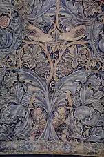 At Queen Square, the Morris family lived in a flat directly above the Firm's shop.[84] They were joined by Janey's sister Bessie Burton and a number of household servants.[85] Meanwhile, changes were afoot at the Firm as Faulkner left, and to replace him they employed a business manager, Warrington Taylor, who would remain with them till 1866. Taylor pulled the Firm's finances into order and spent much time controlling Morris and ensuring that he worked to schedule.[86] During these years the Firm carried out a number of high-profile designs; from September 1866 to January 1867, they redecorated the Armoury and Tapestry Room in St James's Palace,[87] in the latter year also designing the Green Dining Room at the South Kensington Museum (it is now the Morris Room at the Victoria and Albert Museum).[88] The Firm's work received increasing interest from people in the United States, resulting in Morris's acquaintance with Henry James and Charles Eliot Norton.[89] However, despite its success, the Firm was not turning over a large net profit, and this, coupled with the decreasing value of Morris' stocks, meant that he had to decrease his spending.[90]