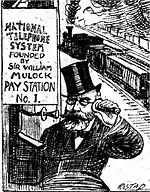 In 1905, Mulock chaired the select parliamentary inquiry into telephone systems, especially the unregulated Bell Telephone monopoly.[37] The committee shed much light on the operations and finances of Bell, but Mulock was replaced when it became apparent that he was likely to recommend the telephone service be a government owned utility. The committee's work nevertheless led in 1906 to the first federal regulation of telephone and telegram service by the Board of Railway Commissioners, the ancestor of the current Canadian Radio-television and Telecommunications Commission. Despite being a wealthy businessman and fervent anticommunist, Mulock believed that government operation of public franchises provided better service at lower cost, with greater protection of personal privacy and public interest.[38]