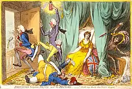 Throughout the 1790s, the war against France was presented as an ideological struggle between French republicanism vs. British monarchism with the British government seeking to mobilise public opinion in support of the war.[51] The Pitt government waged a vigorous propaganda campaign contrasting the ordered society of Britain dominated by the aristocracy and the gentry vs. the "anarchy" of the French revolution and always sought to associate British "radicals" with the revolution in France.[52] Though the Pitt government did drastically reduce civil liberties and created a nationwide spy network with ordinary people being encouraged to denounce any "radicals" that may have been in their midst, the historian Eric Evans argued the picture of Pitt's "reign of terror" as portrayed by the Marxist historian E.P. Thompson is incorrect, stating there is much evidence of a "popular conservative movement" that rallied in defence of King and Country.[53] Evans wrote that there were about 200 prosecutions of "radicals" suspected of sympathy with the French revolution in British courts in the 1790s, which was much less than the prosecutions of suspected Jacobites after the rebellions of 1715 and 1745.[52] However, the spy network maintained by the government was efficient. In Jane Austen's novel Northanger Abbey, which was written in the 1790s, but not published until 1817, one of the characters' remarks that it is not possible for a family to keep secrets in these modern times when spies for the government were lurking everywhere. This comment captures well the tense, paranoid atmosphere of the 1790s, when people were being encouraged to report "radicals" to the authorities.[54]