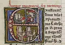 William and his travelling companions set off on horseback on 16 September 1253 on a 9,000-kilometre (5,600 mi) journey to the court of the Great Khan at Karakorum. Arriving in late December they were received courteously, and he was given an audience on 4 January 1254.[4] William's account provided an extensive description of the city's walls, markets and temples, and the separate quarters for Muslim and Chinese craftsmen among a surprisingly cosmopolitan population. He also visited the court of the Vastacius (Empire of Nicaea) during the feast day of Felicitas and met Nicaean envoys during his travels. Among the Europeans he encountered were the nephew of an English bishop, a woman from Lorraine who cooked William's Easter dinner, and a French silversmith who was making ornaments for the Khan's women and altars for the Nestorian Christians.[5] Guillaume Boucher was the Frenchman.[6]