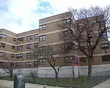 The Williamsburg Houses were built in 1936–1938 under the auspices of the Housing Division of the Public Works Administration (PWA).[4] The project was originally segregated, only allowing white residents.[5] It was one of the first and most costly (in 1937 dollars) of New York City housing projects. New York City Mayor Fiorello La Guardia poured the first shovel of concrete for the project and was a strong supporter of the project despite its cost ($12.5 million in 1936).[6] The site is the former home of Williamsburg Continuation School and the Finco Dye and Print Works Inc.[7]