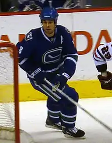 With the departure of long-time Canucks captain Markus Näslund to free agency in the 2008 off-season, Mitchell was considered a leading candidate for captaincy.[45] The Canucks instead appointed team MVP Roberto Luongo as the first goaltender to be a captain since 1947–48 on September 30, 2008.[46] Mitchell was named alternate captain along with forward Ryan Kesler and defenceman Mattias Öhlund.[46] Due to Luongo's limitations as a goaltender, Mitchell was designated the captain's traditional role of disputing calls by the officials and relaying messages to the coach.[46]