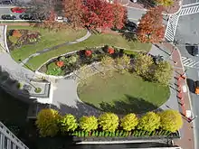 Designed by Bob Good, of Good & Stephenson, The park is characterized by its location in the midst of high-rise luxury condominium buildings. While there is some traffic noise, the park is generally quiet with few users. Sharing the intersection is a Chipotle Restaurant, the edge of the Geico Corporate campus, and a new park directly across the street.