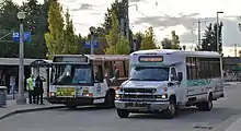 The transit center is served by TriMet bus lines 52, 59 and 88.[23] Midibuses of Columbia County's CC Rider transit service also stop there on weekdays, providing direct service to Scappoose and St. Helens.[25] Landscaping at the station included trees that bloom (cherry), which TriMet traditionally shuns in favor of non-blooming tree species due to higher maintenance costs of the blooming trees.[26] These were replaced by non-blooming trees during construction of the PCC building in 2008. The station was designed by architectural firm OTAK of Lake Oswego.[27]