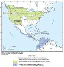 The subspecies are best distinguished from each other by their songs.[8] In addition, the four subspecies have significant genetic differences based on mitochondrial DNA analysis.[9] Their winter ranges have been elucidated using mitochondrial DNA genetic studies of 172 birds sampled in winter combined with plumage coloration and morphological differences.[2]