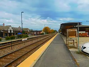 Wilmette is the name of a commuter railroad station in Wilmette, Illinois, U.S. that is served by Metra's Union Pacific/North Line. Trains go south to Ogilvie Transportation Center and as far north as Kenosha, Wisconsin. Travel time to Ogilvie is 31 minutes on local trains, and as little as 27 minutes on morning inbound trains and 22 minutes on one afternoon inbound train. In Metra's zone-based fare system, Wilmette is in zone C. As of 2018, Wilmette was the 18th busiest of Metra's 236 non-downtown stations, with an average of 1,653 weekday boardings.[1]