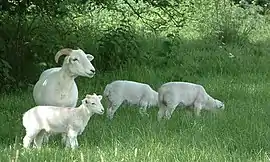 The Wiltshire Horn is a breed of domestic sheep originally from Wiltshire in southern England raised for meat.[1] The breed is unusual among native British breeds, for it has the unusual feature of moulting its short wool and hair coat naturally in spring, alleviating the need for shearing.[2] They are good mothers and have high fertility. The fact that they do not require shearing or crutching and do not suffer readily from flystrike is making them increasingly attractive to the commercial sheep sector, particularly as even pure-bred lambs can reach slaughter weight in as little as 16 weeks.