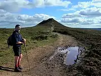 The hill's counterpart, Lose Hill, lies to the west on the opposite side of the River Noe. In relatively recent times, the two hills' names have prompted a fanciful tale concerning the outcome of an imagined 7th-century battle between the forces of Edwin of Northumbria and Cynegils of Wessex.[1] Edwin's forces occupied Win Hill, while Cynegils' men camped on Lose Hill. As the battle progressed, Cynegils' forces advanced up Win Hill, and Edwin's retreated behind a temporary wall they had built near the summit. They pushed the boulders of the wall downhill, crushing the Wessex soldiers and gaining victory in the battle. However, there is no historical basis for the tale, and no evidence of any battle ever being fought here. A more prosaic explanation for the name is that Win Hill was originally recorded as Wythinehull, meaning "Withy Hill" or "Willow Hill". Fragments of willow can still be found in the otherwise largely coniferous plantation on the approach from Yorkshire Bridge.[2]