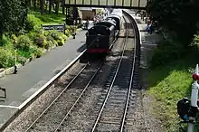 The Gloucestershire Warwickshire Railway reopened the line between Toddington and Winchcombe on 2 August 1987.[25][26] A signal box was obtained from Hall Green and rebuilt on the foundations of the original structure,[27] with the 37-lever frame coming from Honeybourne West Loop Box.[28] The former Great Western Railway station building at Monmouth Troy was dismantled stone-by-stone and re-erected at Winchcombe in 1986.[29] The platform slabs came from Birmingham Snow Hill and Cheltenham St James.[28] The only original buildings left are the old goods shed, now the main workshop for the carriage and wagon group on the railway, and the weighbridge. Bidirectional signalling has been installed as has a passing loop through the station, which has been operational since 12 July 1997. [30] Since 2012, the station, and indeed parts of the line itself, have been used for scenes in the television series Father Brown.