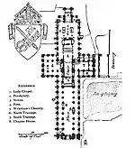Wykeham's successor, Henry of Beaufort (1405–1447) carried out fewer alterations, adding only a chantry on the south side of the retrochoir, although work on the nave may have continued through his episcopy.[15] His successor, William of Waynflete (1447–1486), built another chantry in a corresponding position on the north side. Under Peter Courtenay (Bishop 1486–1492) and Thomas Langton (1493–1500), there was more work. De Luci's Lady chapel was lengthened, and the Norman side aisles of the presbytery replaced. In 1525, Richard Foxe (Bishop 1500–1528) added the side screens of the presbytery, which he also gave a wooden vault.[10] With its progressive extensions, the east end is now about 110 feet (34 m) beyond that of Walkelin's building.[16]